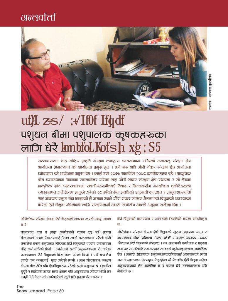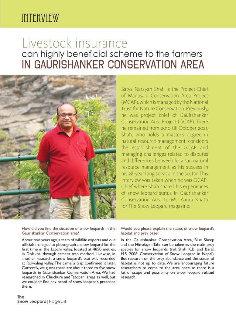 In December 2021, I worked as a staff reporter for The Snow Leopard Magazine, Volume 7, published by the Snow Leopard Conservancy. Under the supervision of Anil Adhikari and Teka Samuha Nepal, I contributed to critical aspects of snow leopard conservation. My responsibilities included