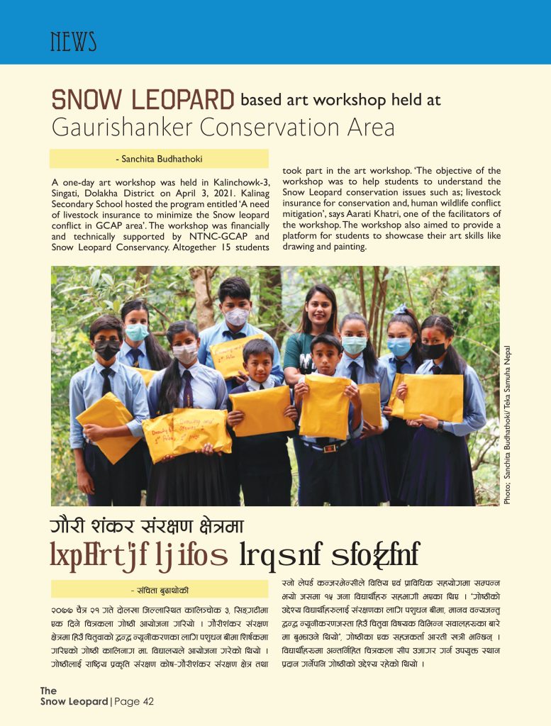 Reporting on a snow-leopard-based art workshop held in the Gaurishankar Conservation Area, showcasing how art fosters community engagement in conservation.